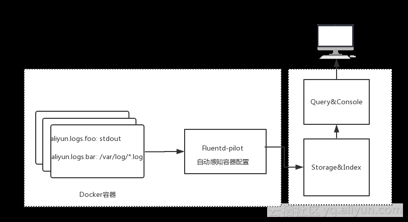 具体是怎么做呢?如图,这是一个简单的结构,在Docker宿主机上面部署一个fluentd-pilot容器,然后在容器里面启动的时候,我们要声明容器的日志信息,fluentd-pilot会自动感知所有容器的配置。每次启动容器或者删除容器的时候,它能够看得到,当看到容器有新容器产生之后,它就会自动给新容器按照你的配置生成对应的配置文件,然后去采集,最后采集回来的日志同样也会根据配置发送到后端存储里面去,这里面后端主要指的elasticsearch或者是SLS这样的系统,接下来你可以在这个系统上面用一些工具来查询等等。整个这一块在Docker宿主机上面,外面的就是外部系统,由这两个部分来组成。