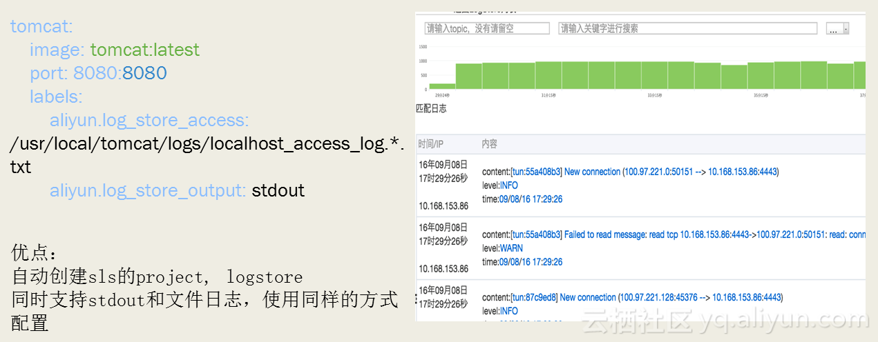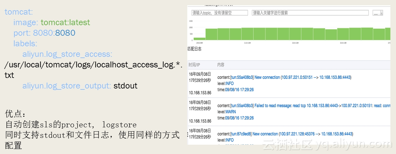 优化优点具体体现在:自动创建sls的project, logstore;同时支持stdout和文件日志,使用同样的方式配置。