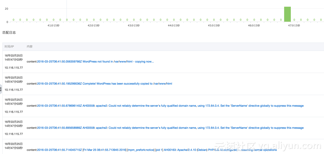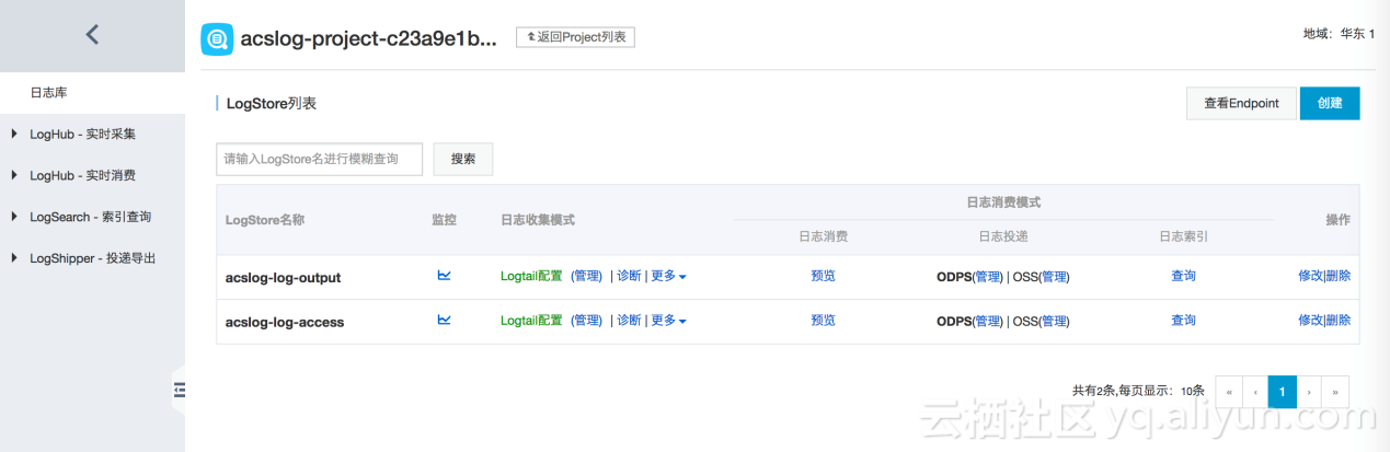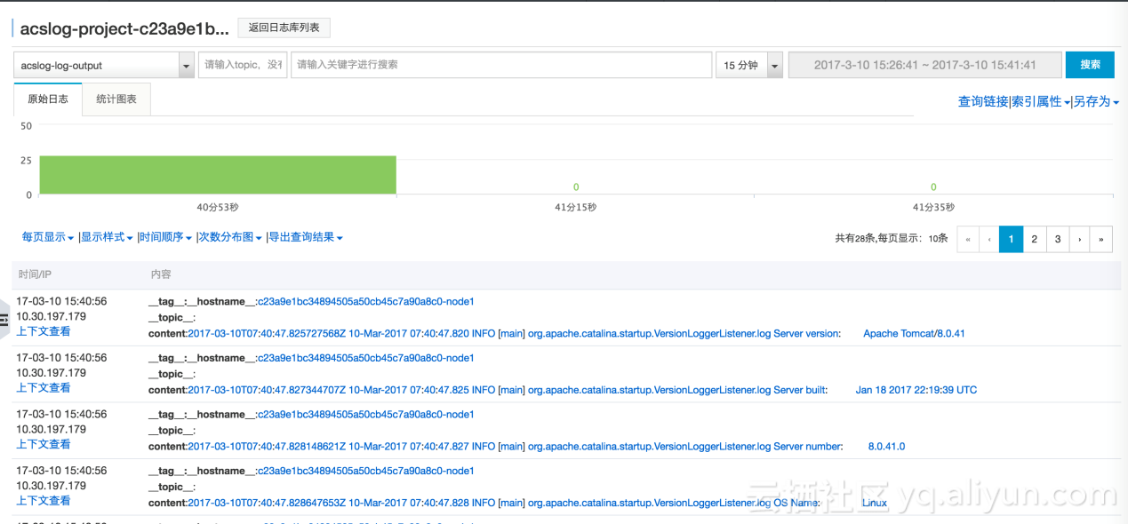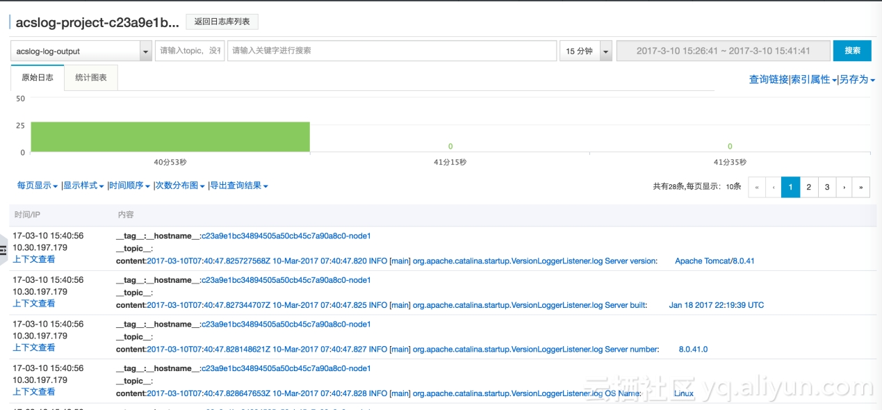 当你通过部署之后,就可以在日志服务上面看到会生成两个东西,都是创建好的,加一些前缀来区分,不用管一些配置,你唯一要做的事是什么呢?点日志索引查询,然后到日志搜索界面,刚才启动的时候一些日志,可以看到从哪过来的,这条日志的内容是什么,这些信息都已经很快的出现了,包括需要检索可以选中一个时间段,输入关健词去做一些搜索,自动在日志服务上创建并配置logstore。