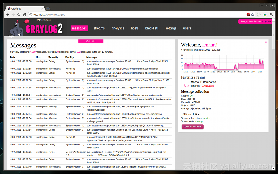 接下来是graylog2,目前不算很流行,但是也是功能很强大的系统,它不像Elasticsearch还需要配合其它去使用,它自身拥有日志存储、索引以及展示所有的功能,都在一个系统里面实现,它可以设置一些报警规则,当日志里面出现一些关键字的时候自动报警,这个功能还是非常有用的,免费、支持集群模式,可以在生产环境里面搭一个Docker用的生产系统。