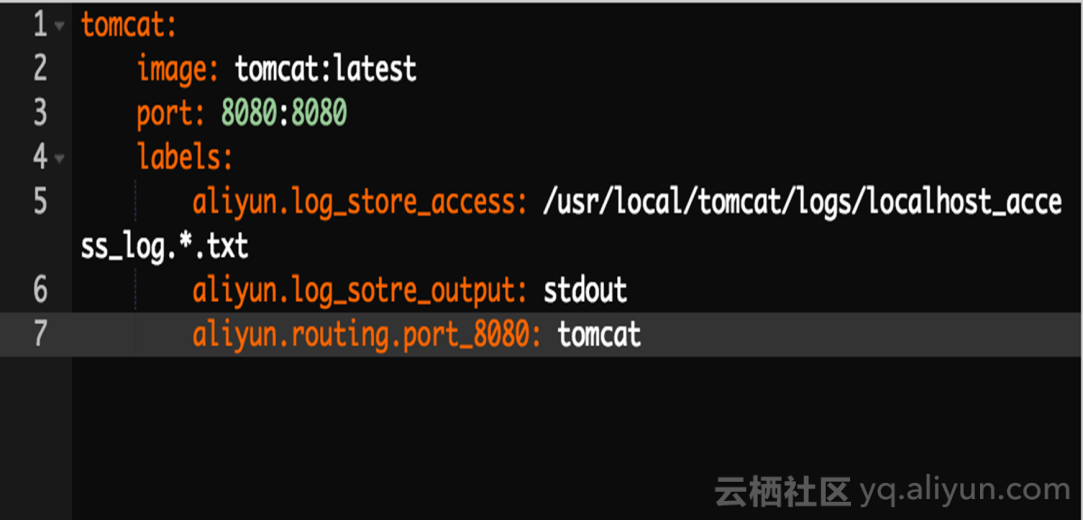 比如在容器服务上面布一个tomcat,可能会写如图的一个标准Docker的模板。