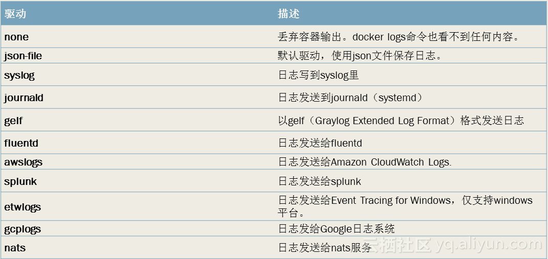其实Docker之前已经支持了很多的logdriver,图中列表是直接从Docker的官方文档上面拿到的。